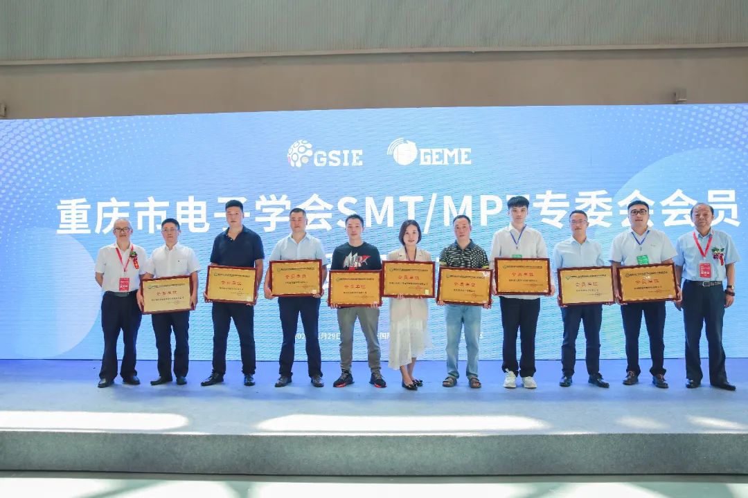 本屆博覽會同期舉辦了“GEME 2022電子產(chǎn)業(yè)鏈創(chuàng)新發(fā)展大會”,匯聚智造精英,共同為電子產(chǎn)業(yè)熱點話題展開交流。會上,重慶市電子學會表面貼裝與微組裝技術委員會為深圳市海目星激光智能裝備股份有限公司授會員單位牌匾。